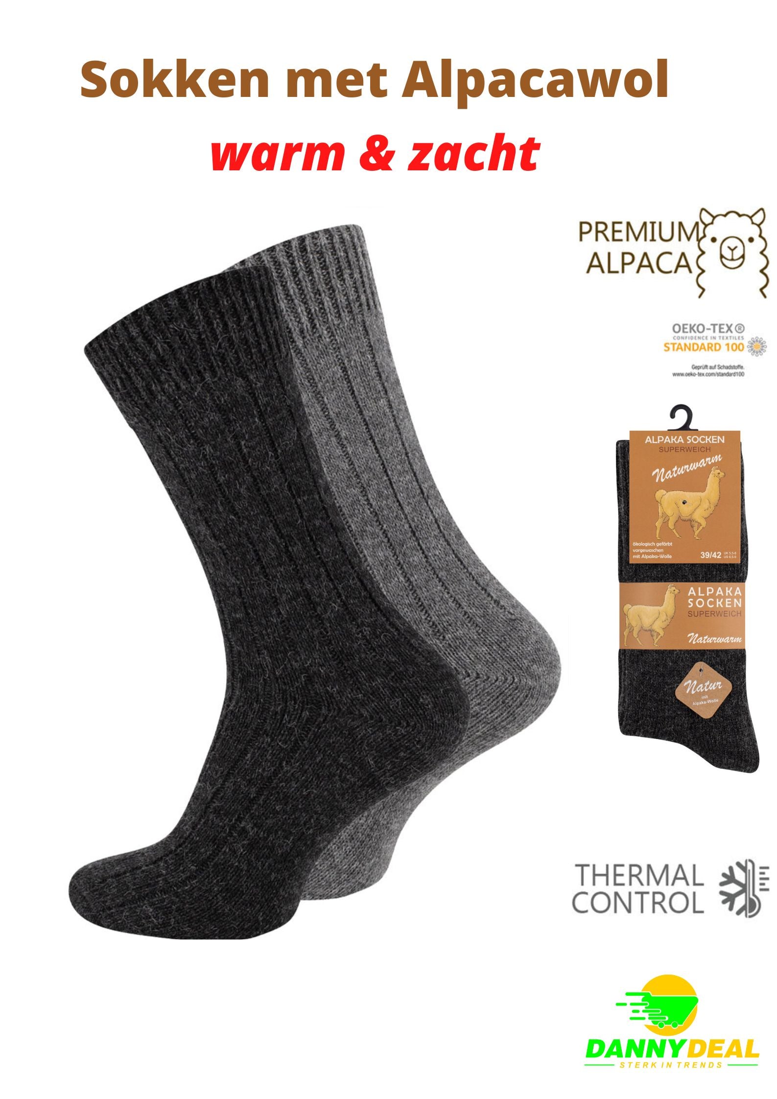 Alpacawol houdt 3 tot 5 keer meer de warmte vast dan gewoon wol en is bovendien lekker zacht. Dit is dus de allerbeste sok voor in de winter. Gemaakt van Alpacawol en Schapenwol om je voeten warm te houden! Ze hebben een comfortabele pasvorm, ook geschikt voor mensen met de maat 43 tot en met 46! Kortom, zeer goede kwaliteit sokken voor een zachte prijs! Verpakt per 2 paar.